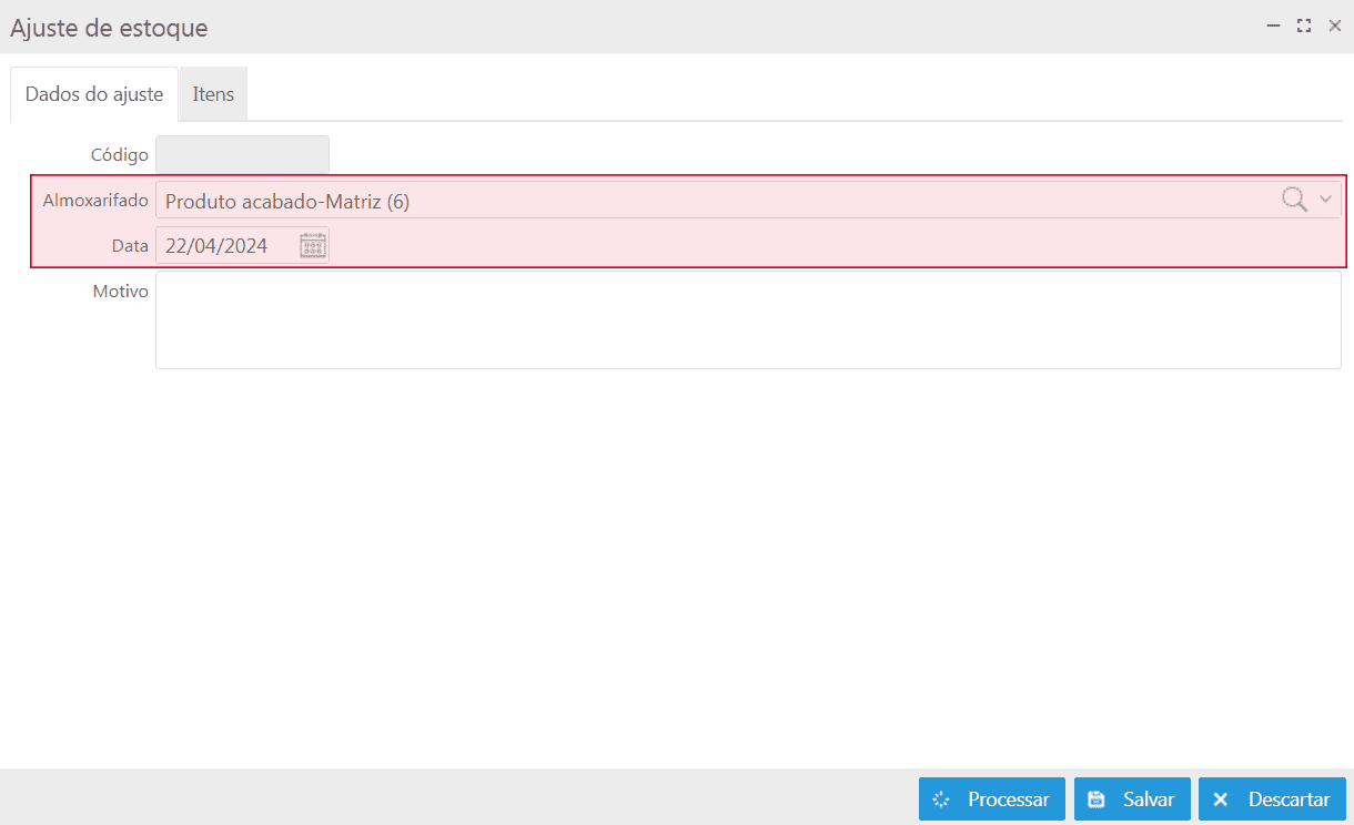 - Na aba Dados do ajuste, informar o almoxarifado onde ocorrerá o ajuste e a data do ajuste;