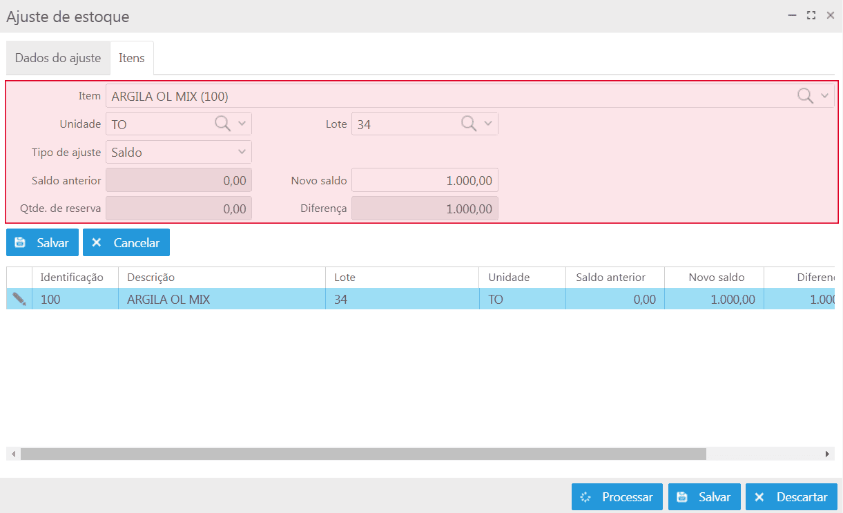 - Para cada item deve-se informar a unidade, o novo saldo e no campo Lote informar o lote correspondente a quantidade ajustada.