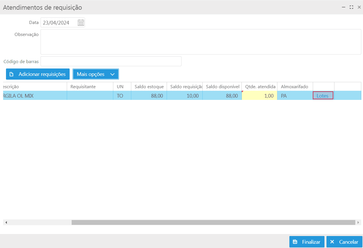 Na lista de itens da tela de atendimento de requisição disponível no botão Mais opções > Atender requisção, quando o item está configurado para controlar lotes, é necessário informar os lotes que serão utilizados para esse atendimento, através do link "Lotes". Nesta tela serão carregados apenas os lotes vinculados ao almoxarifado, que estejam com Status "Aberto" e possuam saldo disponivel. Também é possível cadastrar novos lotes, através do ícone .