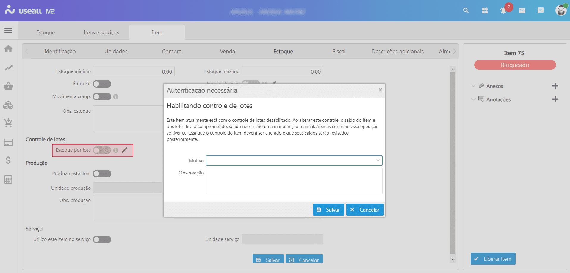 Este item atualmente está com o controle de lotes desabilitado. Ao alterar este controle, o saldo do item e dos lotes ficará comprometido, sendo necessário uma manutenção manual. Apenas confirme essa operação se tiver certeza que o controle do item deverá ser alterado e que seus saldos serão revisados posteriormente.