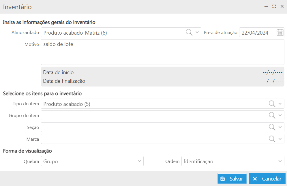 Nos campos Data fabricação e Data validade, basta informar as respectivas datas conforme o lote e clicar no botão Salvar.