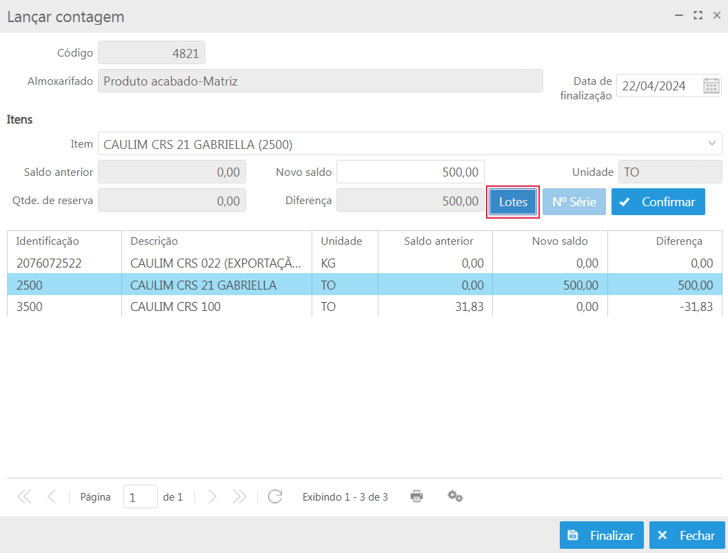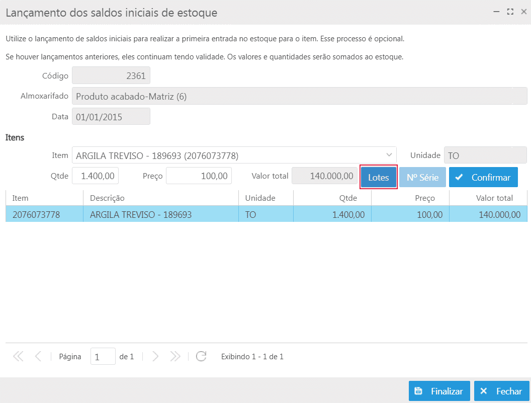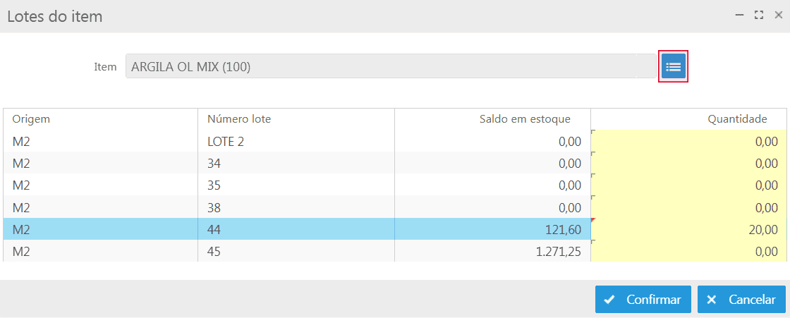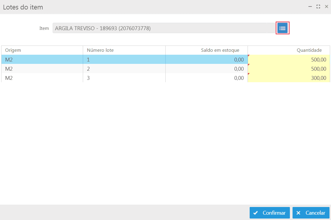 Caso o item seja configurado para controlar lotes, deve-se efetuar a devida identificação para que o sistema possa realizar o controle de movimentação de lotes nos processos do sistema.