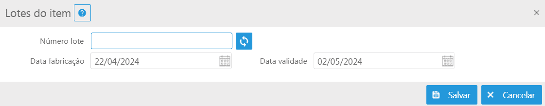 No campo Número lote pode-se informar o número do lote manualmente ou gerar uma numeração de forma automática, clicando no botão