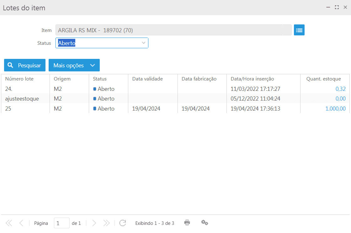 Na tela de manutenção de lotes, disponível no módulo Estoque > Itens e serviços > botão Mais opções > Manutenção de lotes, pode-se criar um novo lote, fechar, reabrir ou alterar as datas de fabricação e validade do lote e consultar a quantidade de estoque por almoxarifado do lote.