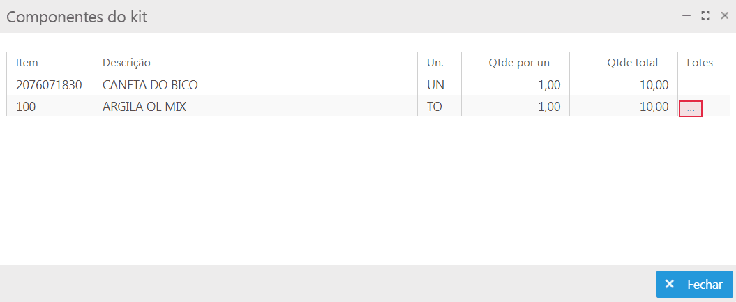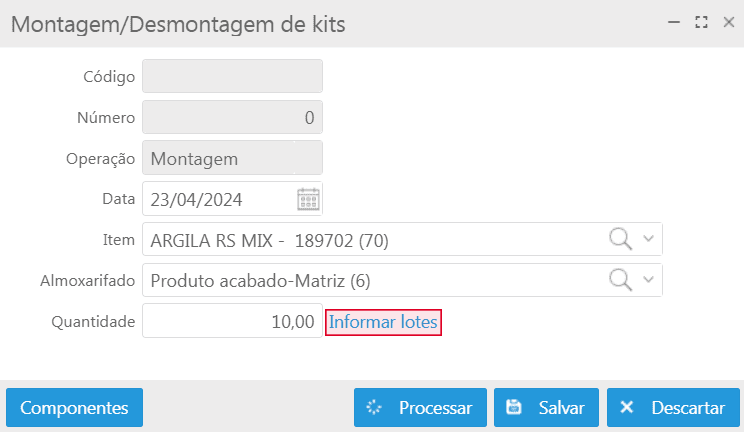 Na tela de montagem de Kits, pode-se ter o kit que controla lote e os componentes que controlam lote. Tanto para o kit como os devidos componentes, é possível inserir um novo lote ou selecionar um lote dentre os já existentes.