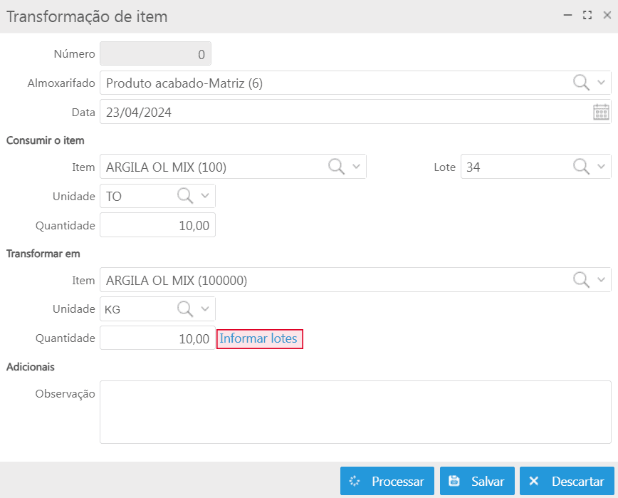 - Na seção Transformar em, deve-se informar o item transformado, a unidade e quantidade. Ao lado deste campo, está disposto o link para informar lotes, sendo possível criar novos lotes através do ícone