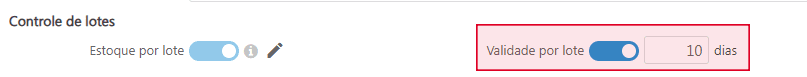 Nesta tela também é possível ativar a opção Validade por lote, basta ativar o ícone e informar a quantidade de dias para o cálculo da validade.