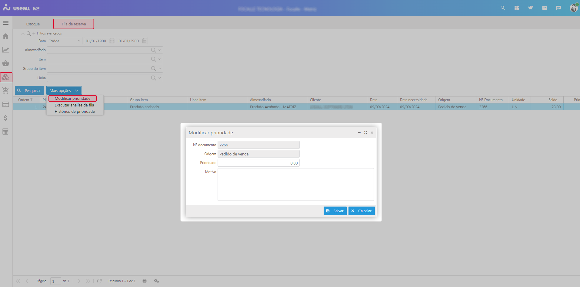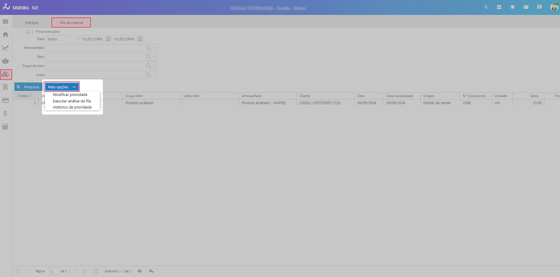 Como mencionado, a alimentação da fila é realizada pelos processos que geram reserva de estoque: Pedido e Requisição. No botão Mais opções na tela de consultas da fila de reserva, estão disponíveis as seguintes ações: Modificar prioridade, Executar análise da fila e Histórico de prioridade.