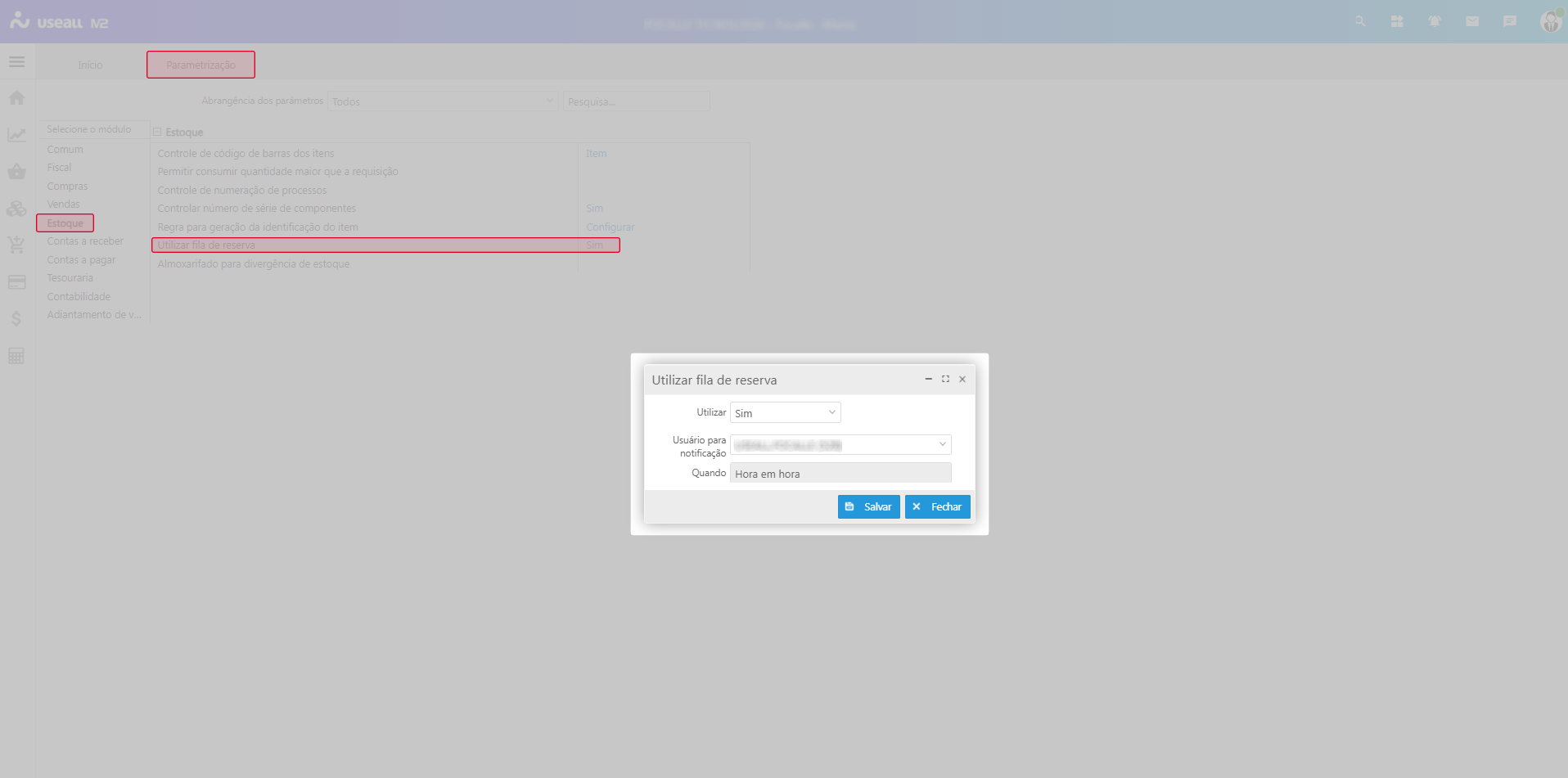 Para ativar a configuração de uso da fila de reservas, deve-se acessar: Início > Parametrização > Estoque > Utilizar fila de reserva.