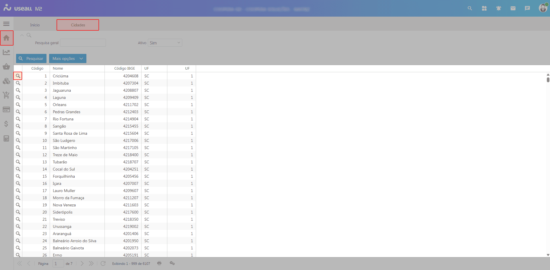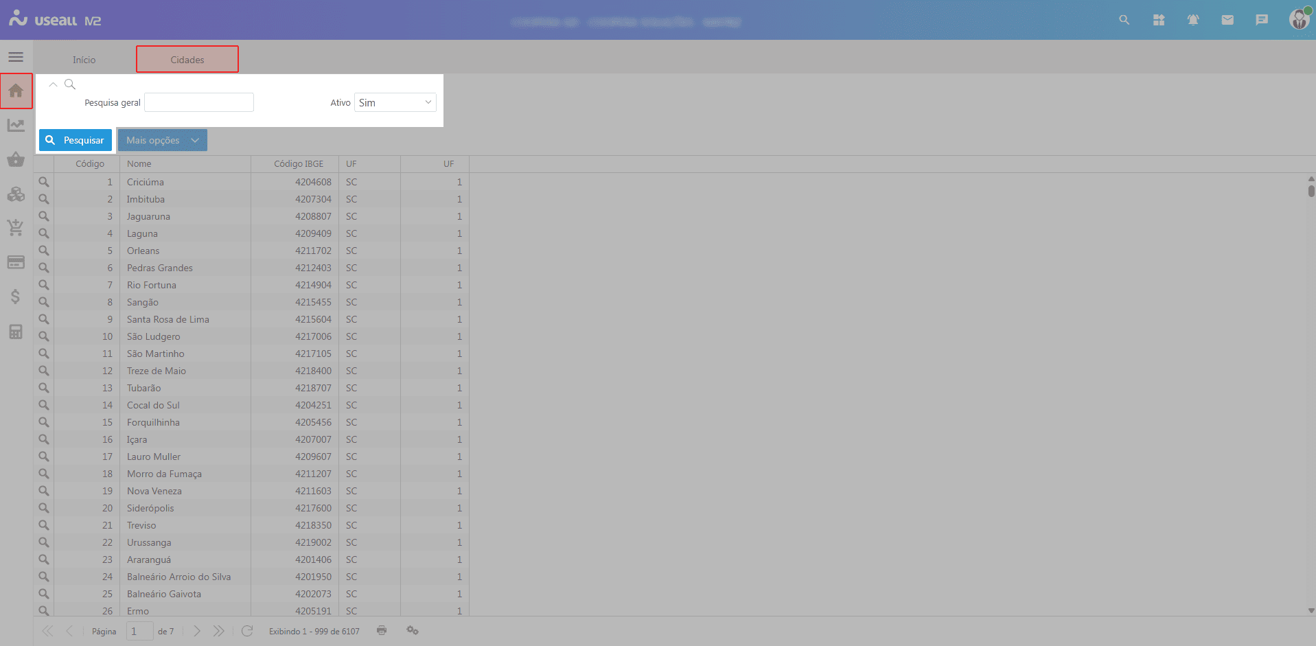 Ao acessar a funcionalidade Cidades, são exibidos os filtros e botão Pesquisar, a grid de informações e o botão Mais opções.