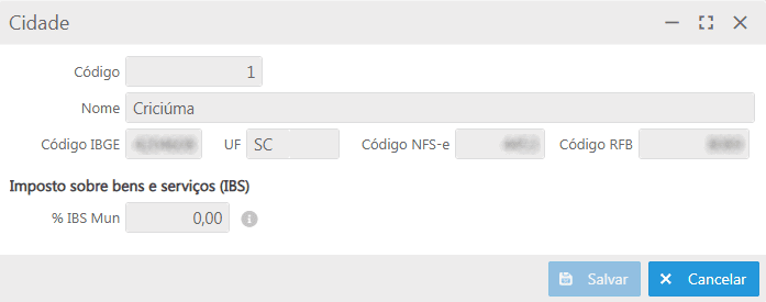 ao clicar nesse ícone ou dar duplo clique sobre a linha do registro, a tela Cidade será exibida, permitindo a visualização das informações.