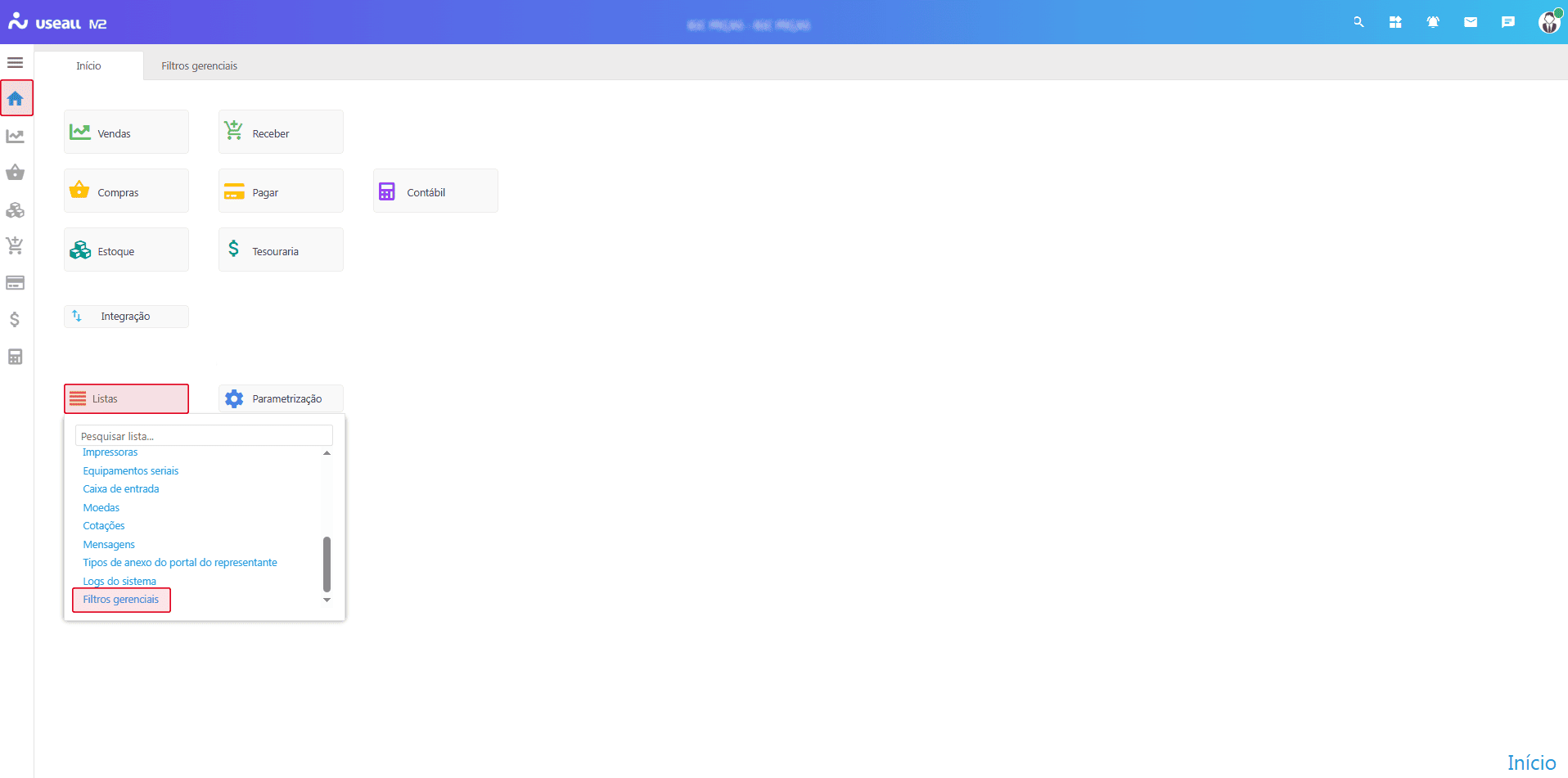 O acesso está disponível no Módulo Início > Listas > Filtros gerenciais.