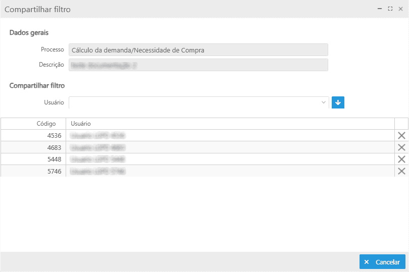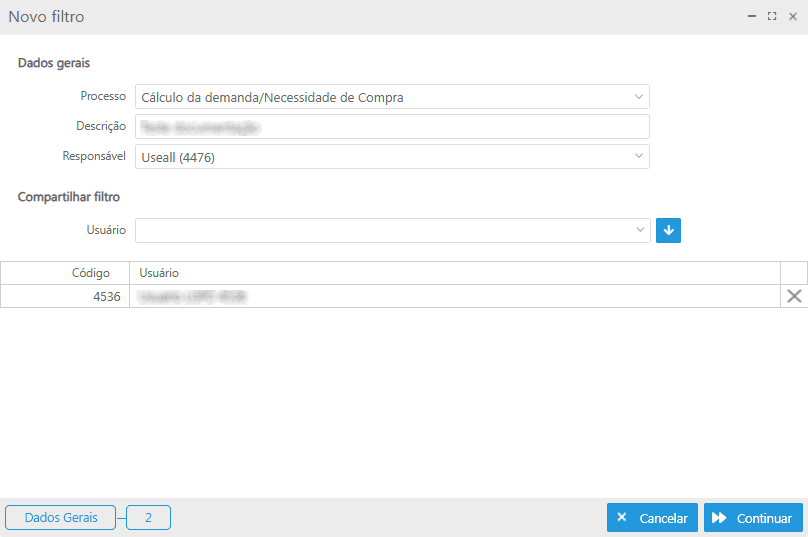 Compartilhar: ao selecionar essa opção, a tela Compartilhar filtro será exibida, permitindo definir com qual usuário o filtro será compartilhado;