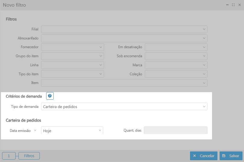 Carteira de pedidos: ao selecionar esse tipo de demanda, os campos Data emissão e Quant. dias ficam disponíveis para preenchimento;