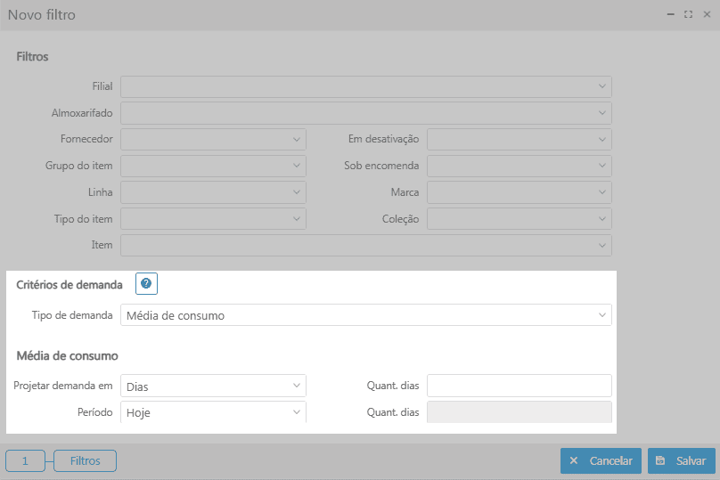 - Média de consumo: ao selecionar esse tipo de demanda, os campos Projetar demanda em, Período e Quant. dias ficam disponíveis para preenchimento;