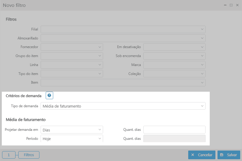 Média de faturamento: ao selecionar esse tipo de demanda, os campos Projetar demanda em, Período e Quant. dias ficam disponíveis para preenchimento;