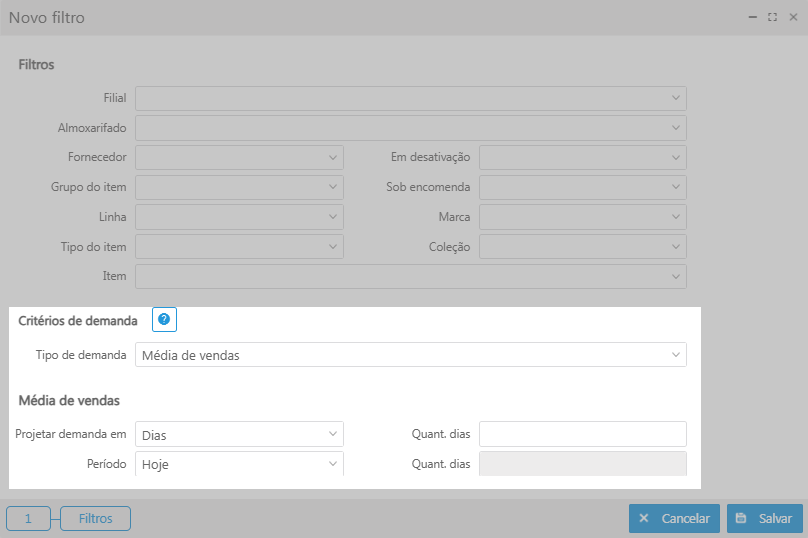 Média de vendas: ao selecionar esse tipo de demanda, os campos Projetar demanda em, Período e Quant. dias ficam disponíveis para preenchimento;