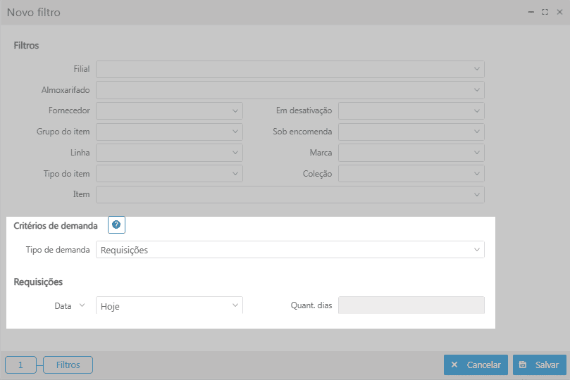 Tipo de demanda: deve-se selecionar o tipo de demanda específico para o novo filtro. Os tipos de demanda disponíveis são: