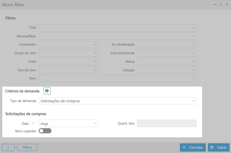 Solicitações de compras: ao selecionar esse tipo de demanda, os campos Data e Quant. dias ficam disponíveis para preenchimento, além da opção Itens urgentes.