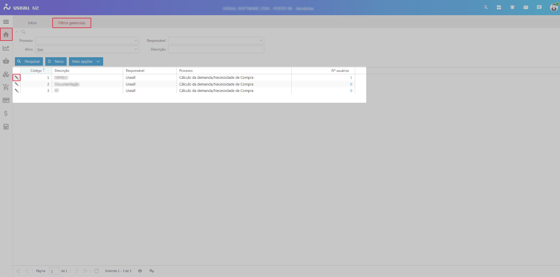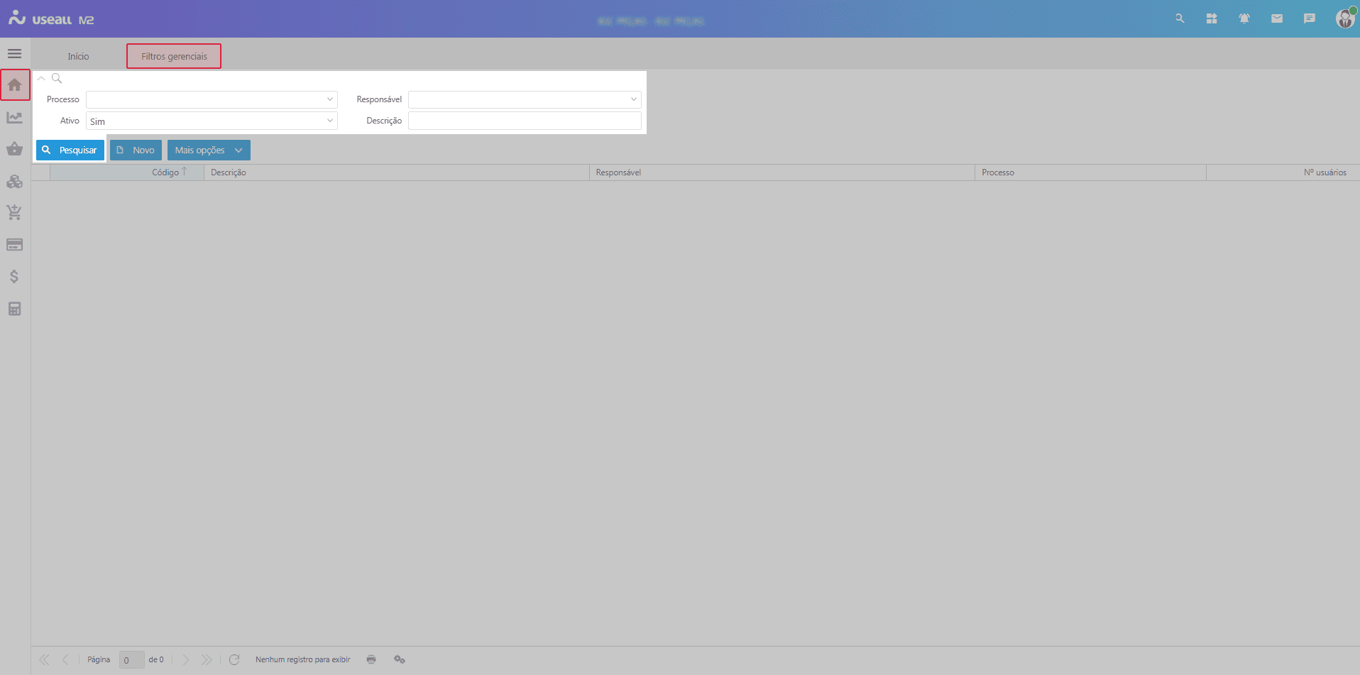 Ao acessar a funcionalidade de Filtros Gerenciais, são exibidos os filtros e botão pesquisar, botão Novo, grid de informações e o botão Mais opções.