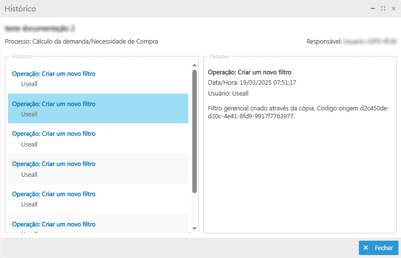 Consultar histórico: ao selecionar essa opção, a tela Histórico será exibida, permitindo a visualização das alterações realizadas no filtro gerencial.