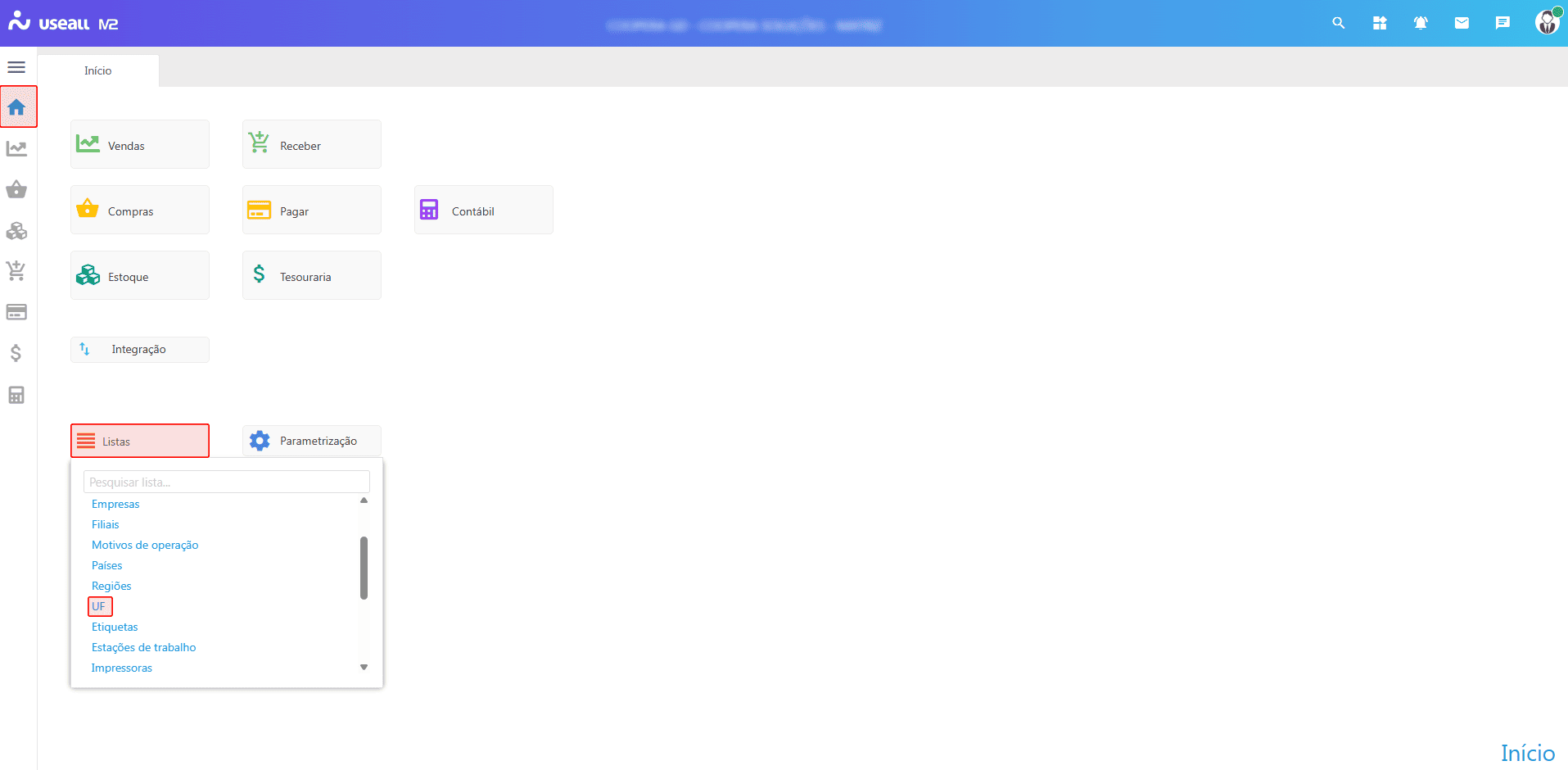 A funcionalidade UF permite consultar as unidades federativas cadastradas no sistema, bem como configurar informações fiscais e contábeis utilizadas nos processos internos.