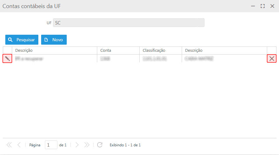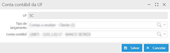 ao clicar nesse ícone ou ao dar duplo clique sobre a linha do registro, a tela Conta contábil da UF será exibida, permitindo a edição das informações;