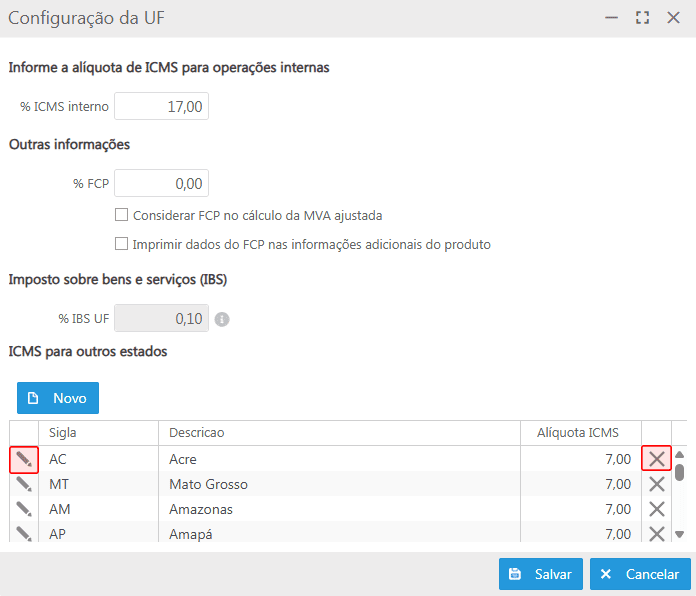 ICMS para Outros Estados: nesa seção pode-se configurar o % de alíquota de ICMS para outros estados. Apresenta o botão Novo e a grid de informações.