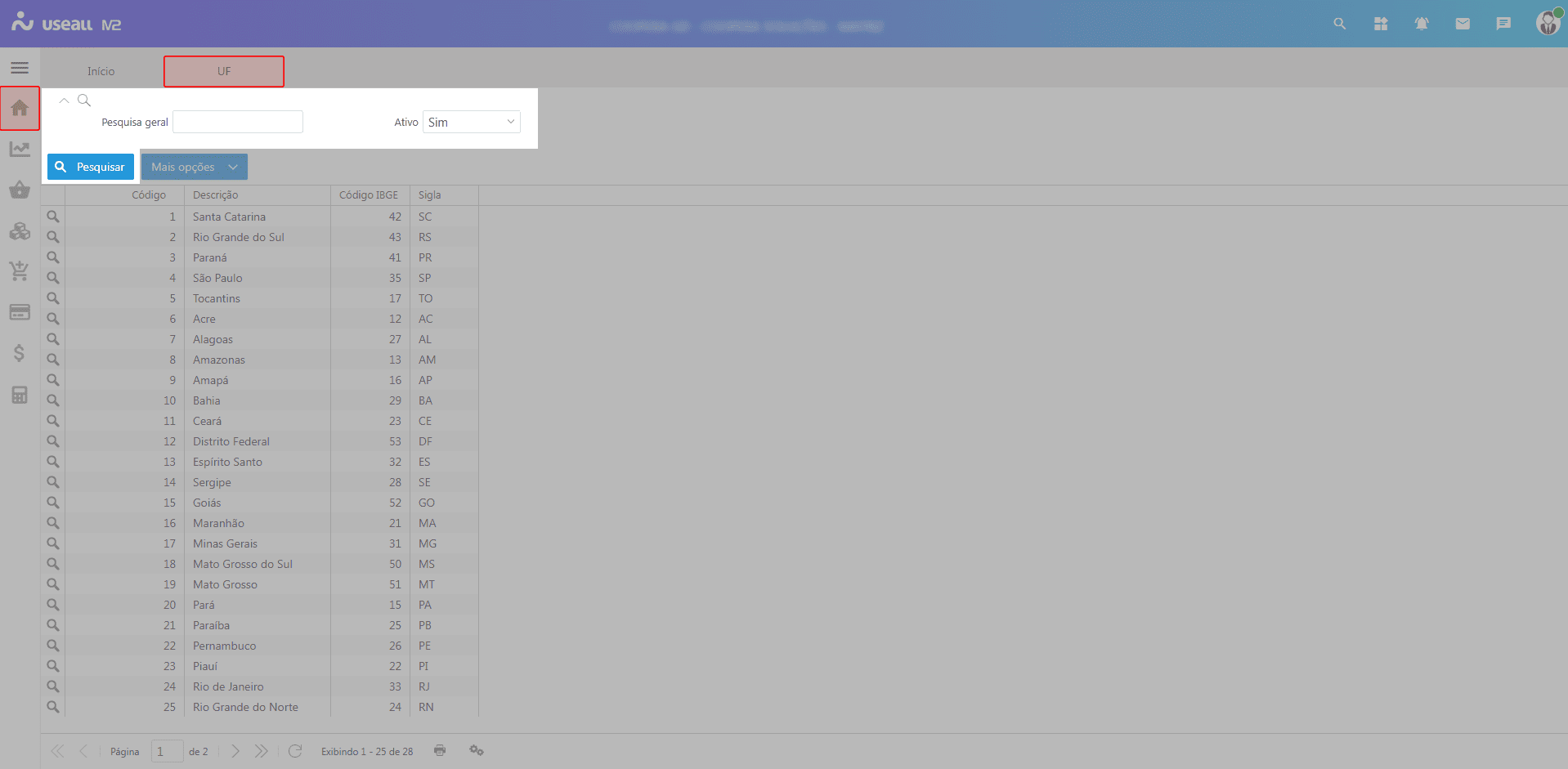 Ao acessar a funcionalidade UF, são exibidos os filtros e botão Pesquisar, a grid de informações e o botão Mais opções.