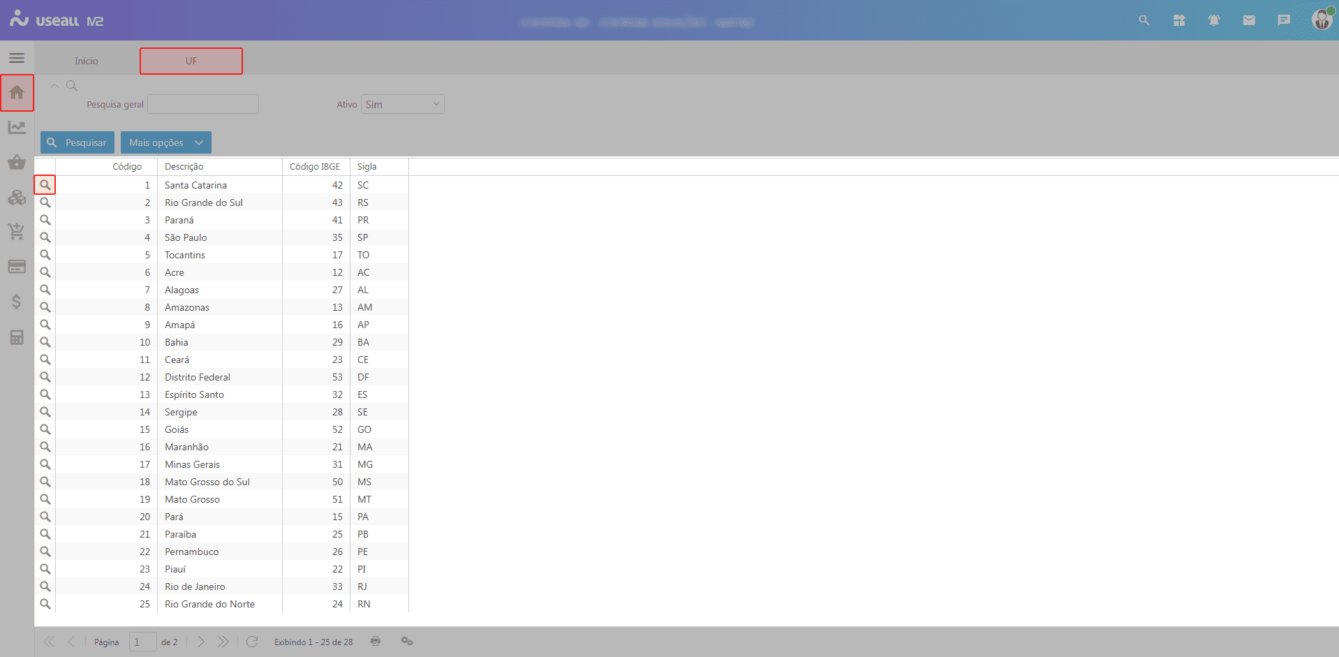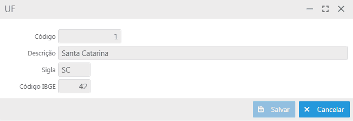 ao clicar nesse ícone ou dar duplo clique sobre a linha do registro, a tela UF será exibida, permitindo a visualização das informações.