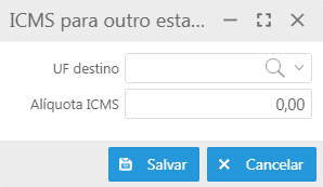 Ao acionar o botão Novo, a tela ICMS para outro estado será exibida, contendo os campos UF destino e Alíquota ICMS.
