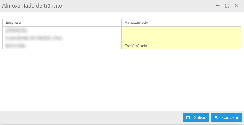 Ao clicar na parametrização, a tela Almoxarifado de Trânsito será exibida, deve-se clicar no ícone na coluna Almoxarifado para localizar o almoxarifado de trânsito cadastrado. Após a seleção, deve-se clicar em Salvar para concluir a parametrização.