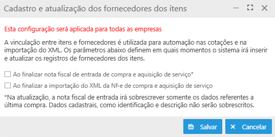 A vinculação entre itens e fornecedores é utilizada para automatizar processos de cotações e de importação do XML. Os parâmetros abaixo definem em quais momentos o sistema irá inserir ou atualizar os registros de fornecedores vinculados aos itens: