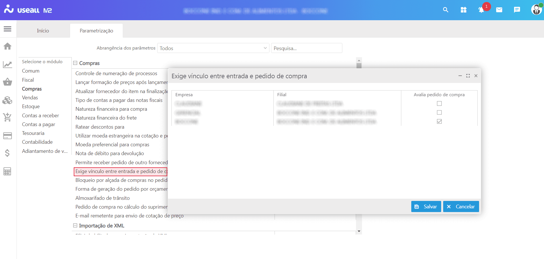 Nesta parametrização, define-se quais filiais poderão realizar a importação do XML da NF-e, seja de forma manual ou automática.