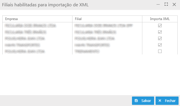 Filiais habilitadas para importação de XML