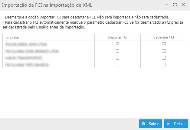 Importar FCI: quando desmarcada, a FCI será descartada, ou seja, não será importada nem cadastrada;