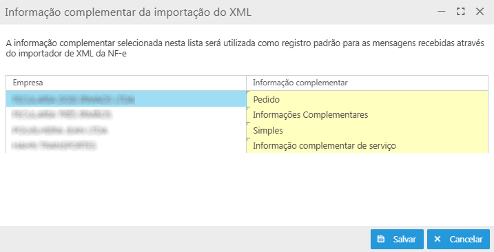 A informação complementar selecionada nesta lista será utilizada como registro padrão para as mensagens recebidas por meio do importador de XML da NF-e.