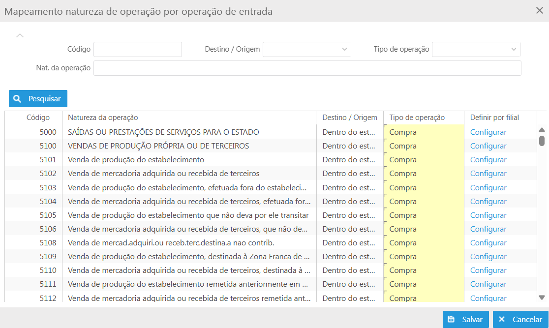 Essa parametrização permite mapear a natureza de operação de cada nota fiscal, assim como seu tipo de operação: