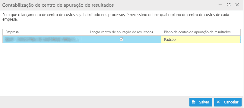 Nesta parametrização, deve-se indicar se o sistema realizará os lançamentos de centro de custos nos processos. Para que os lançamentos de centro de custo sejam habilitados corretamente, é necessário definir o plano de centro de custo correspondente à empresa.
