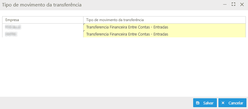 Nesta parametrização, deve-se definir o tipo de movimento financeiro utilizado nas transferências de entrada.