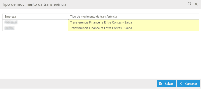 Nesta parametrização, deve-se definir o tipo de movimento financeiro utilizado nas transferências de saída.