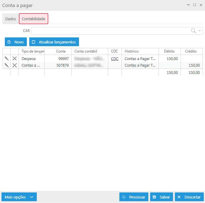 Essa aba será exibida quando o tipo de conta a pagar estiver habilitado para contabilização. Nela, estarão disponíveis o campo CAR, a grid com os lançamentos contábeis, os botões Novo e Atualizar lançamentos.