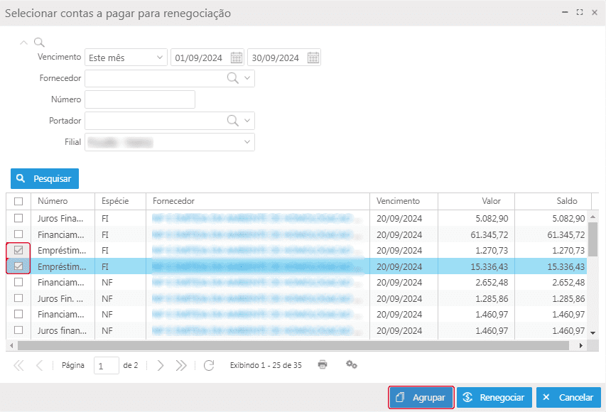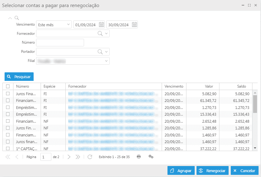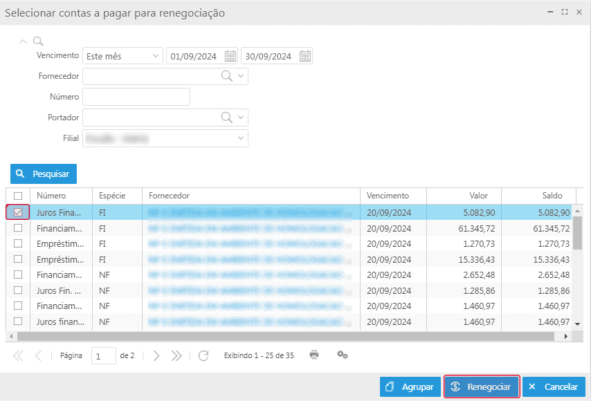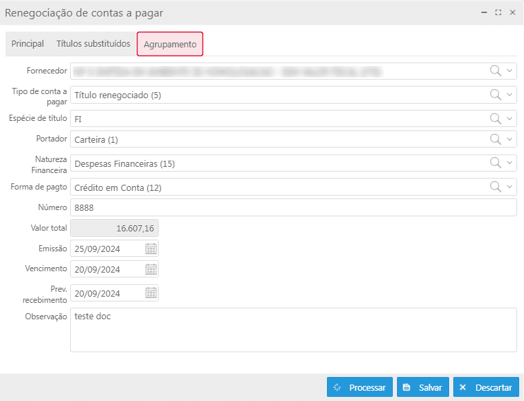 Ao selecionar os registros desejados e clicar no botão Agrupar, a tela Renegociação de contas a pagar será exibida, permitindo a renegociação por agrupamento dos títulos selecionados.