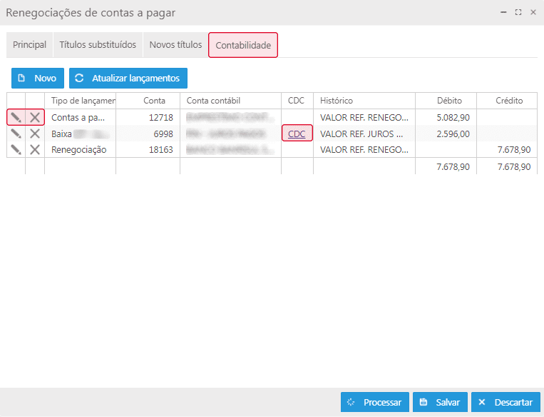 Nessa aba, estarão disponíveis na grid os dados contábeis correspondentes às renegociações das contas a pagar do título. Ao clicar no ícone , a tela Lançamento contábil será exibida para realizar alterações. Para excluir um registro, basta clicar no ícone