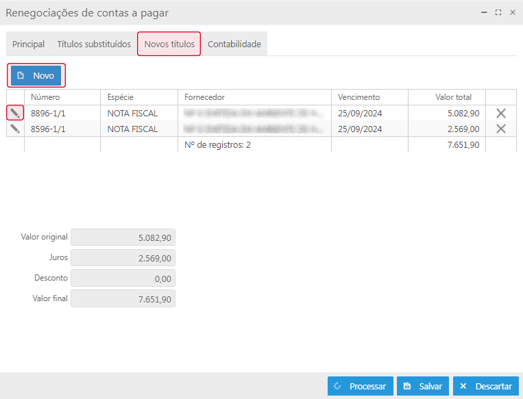 Ao selecionar os registros desejados e clicar no botão Renegociar, a tela Renegociação de contas a pagar será exibida, permitindo a renegociação dos títulos selecionados.