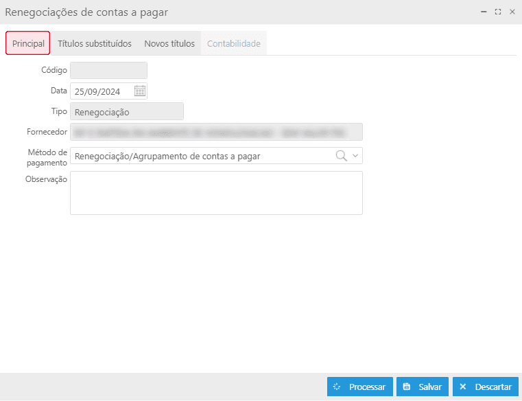 Nessa aba, o campo Tipo virá preenchido como Renegociação, e o campo Fornecedor virá preenchido conforme o correspondente. Deve-se informar a Data e o Método de pagamento além de ser possível registrar uma Observação adicional.