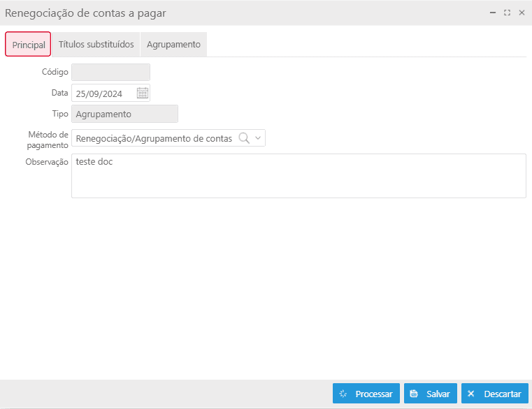 A tela de Renegociação de contas a pagar apresenta três abas: Principal, Títulos substituídos e Agrupamento.