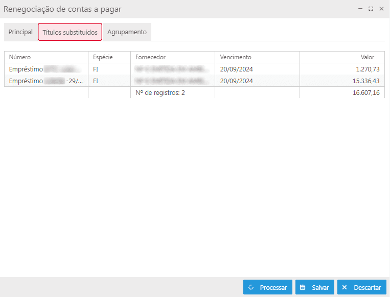 Nessa aba, a grid apresentará o número, espécie, fornecedor, vencimento e valor dos títulos selecionados para agrupamento.