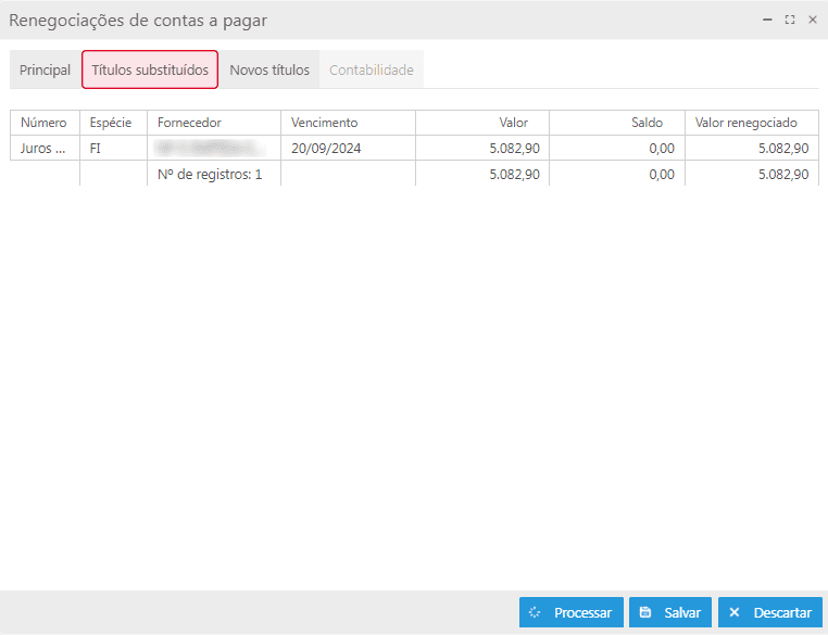 A tela de Renegociação de contas a pagar apresenta quatro abas: Principal, Títulos substituídos, Novos títulos e Contabilidade.