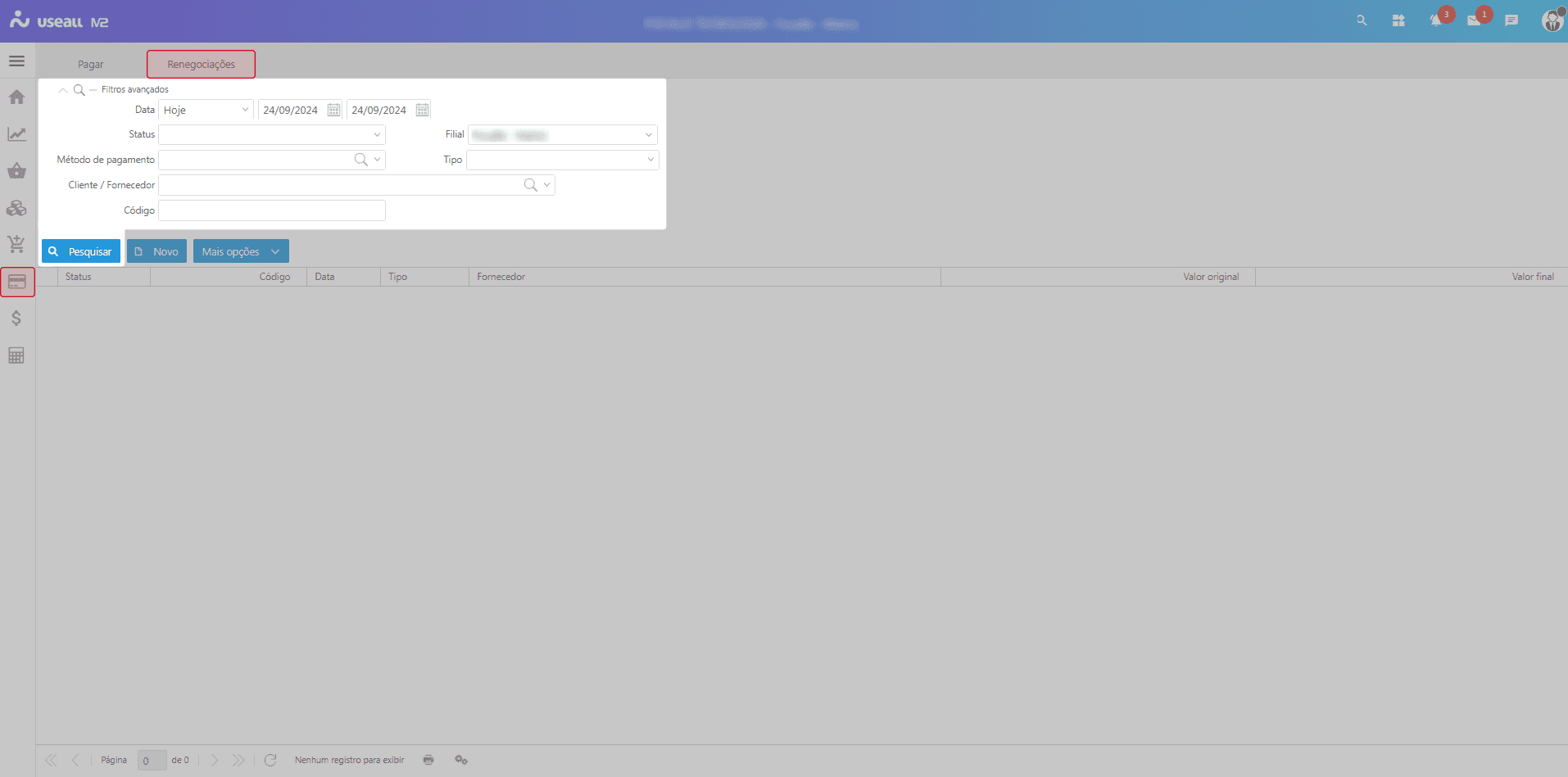 Ao acessar a funcionalidade de Renegociações de contas a pagar são exibidos os filtros e botão pesquisar, botão Novo, grid de informações e o botão Mais opções.